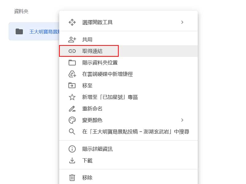 選取資料夾並點選滑鼠右鍵,找到「取得連結」或「共用」,兩者都能進到相同的設定頁面,只要牽涉到與他人連結的設定,都需要在此頁面操作。